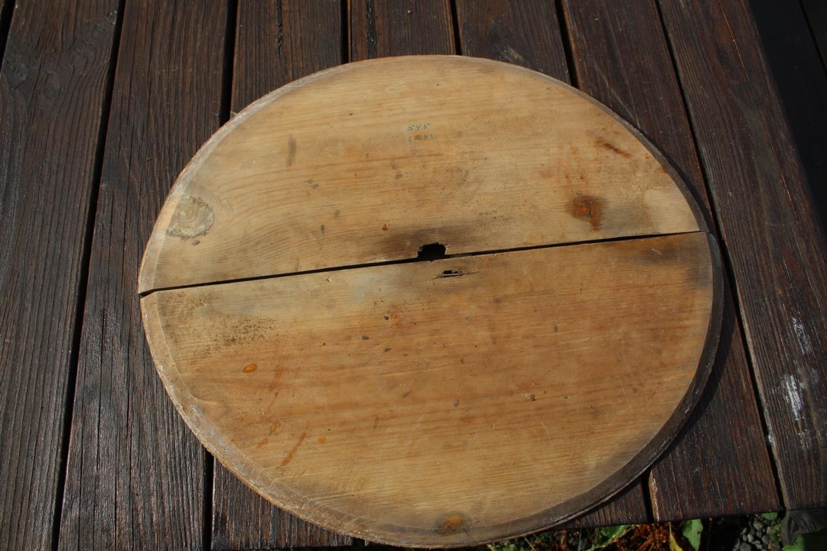 Trébakki. Stærð: þvermál um op 47.5 cm - um botn 44.5 cm. Dýpt, utanmál 12 cm. Stafir úr eik en botn úr furu. Ekkert tappagat. Botn nokkuð skemmdur (1958).