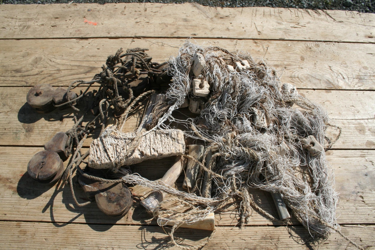 Lengd 9 m, dýpt 80 cm, möskvastærð 5 x 5 cm. Efri þinur úr ullarbandi en neðri þinur úr samkembdu ull- og hrosshári. Felligarn lín. Soppar úr korki en netjabein kindarleggir.