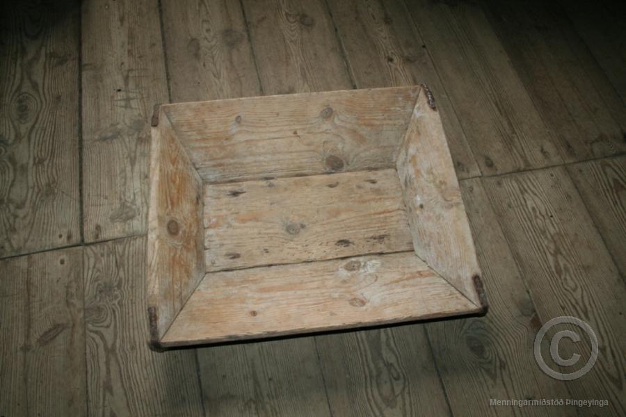 Brauðtrog. Lengd í op 52 cm, breidd 44 cm, lengd í botn 40 cm, breidd 13 cm. Járnspengur á hornum að ofan.