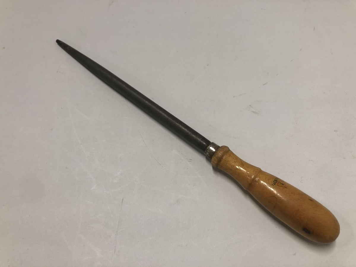 Stálbrýni með tréskafti úr fórum Gunnlaugs Vilhjálmssonar lögregluþjóns á Selfossi. Unnur Gunnlaugsdóttir afhenti gripinn.