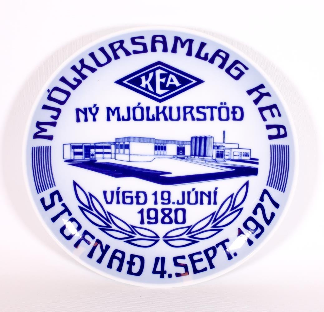 Platti hvítur með bláu letri og mynd. Áletrun: Mjólkursamlag KEA (+logo) Ný mjólkurstöð. Vígð 19. júní 1980. Stofnað 4. sept. 1927. Mynd af nýju húsnæðinu. Aftan á plattanum stendur: Hönnun BS. Eintök 600.