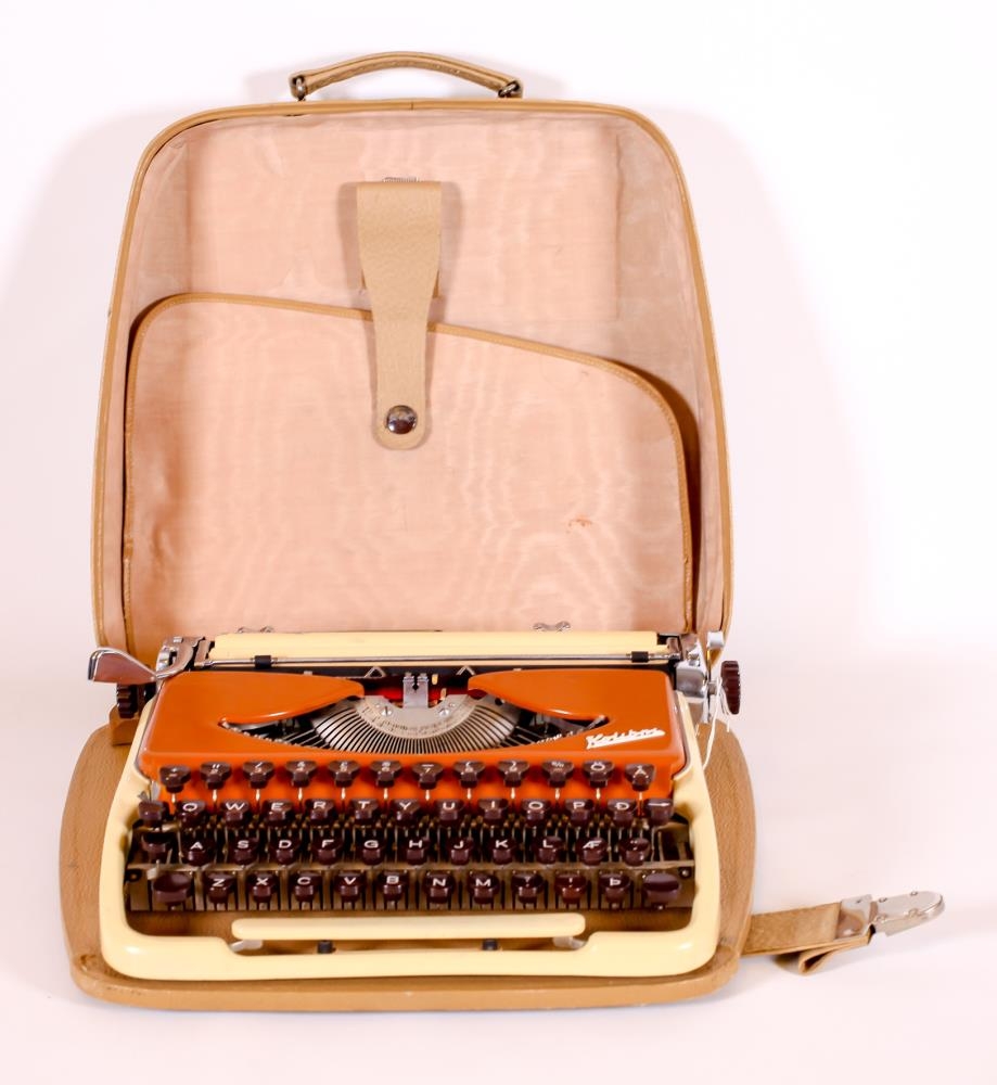 Ljós dröppuð og brún ritvél í ljós brúnni leður tösku með silfraðri smellu. Innan í töskuloki er hólf með leiðbeiningabækling, rauðum með mynd af ritvél. Vélin er merkt með merki renning svörtum : Eysteinn Reynisson. Vélin sjálf er með logo Groma. Made in Germany.