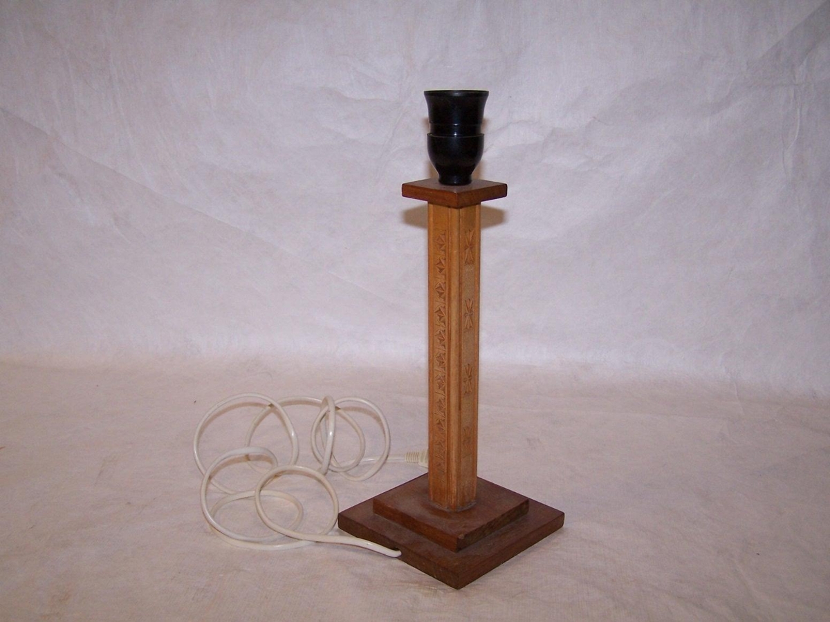 Útskorinn lampi. Tvenns konar viðartegundir - útskurður virðist vera eftir Sigurð Egilsson frá Laxamýri.