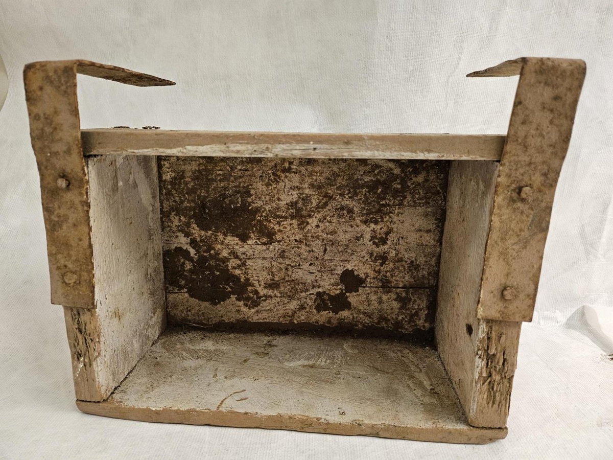 Beitutrog úr furu. Málmkrókar til að festa við hlið bátsins. 25.5 cm x 17cmx 11cm. Trogið er tómt.
