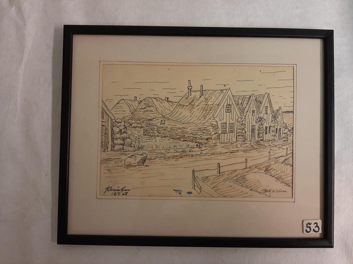 Teikning (túss) af gamla torfbænum á Þverá í Laxárdal, gerð árið 1958. Niðri í hægra horni myndarinnar stendur "Ben. Jónss." og er myndin því væntanlega teiknuð af Benedikt Jónssyni. Myndin er í svörtum ramma.