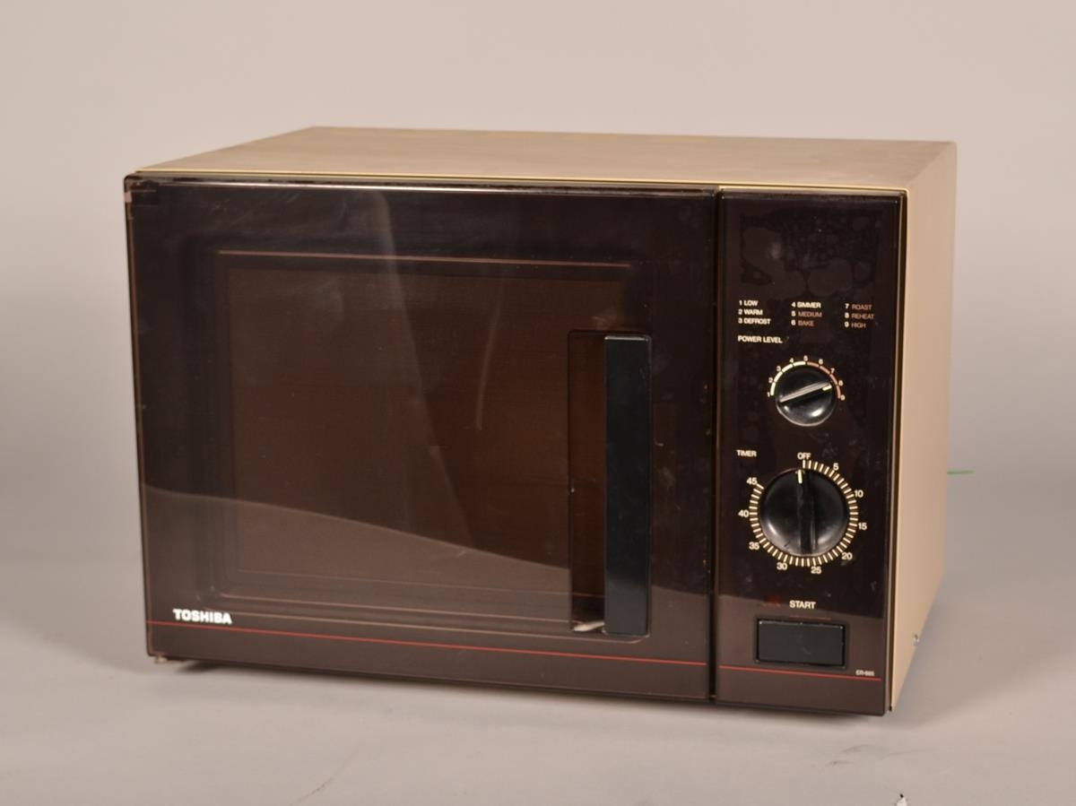 Drapplitaður, gamall örbylgjuofn með reyklitaðri glerhurð.