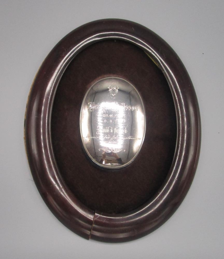 Minningarskjöldur úr silfri,sporöskjulagaður, 15 x 11 cm að stærð. Skjöldurinn er festur á brúnt flauel og innrammaður í brúnan ramma og undir gleri. Á honum stendur: Kristján Hallsson f. 26.11.1904, d. 9.8.1929. Hvíl í friði. Minning frá fjelagssystkinum og vinum.