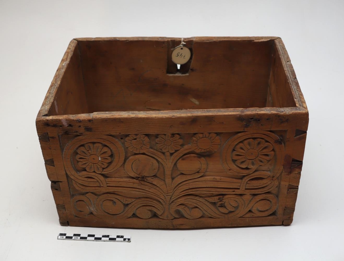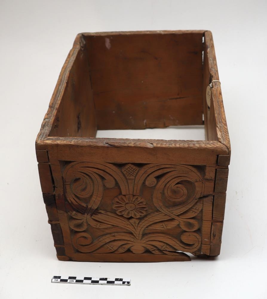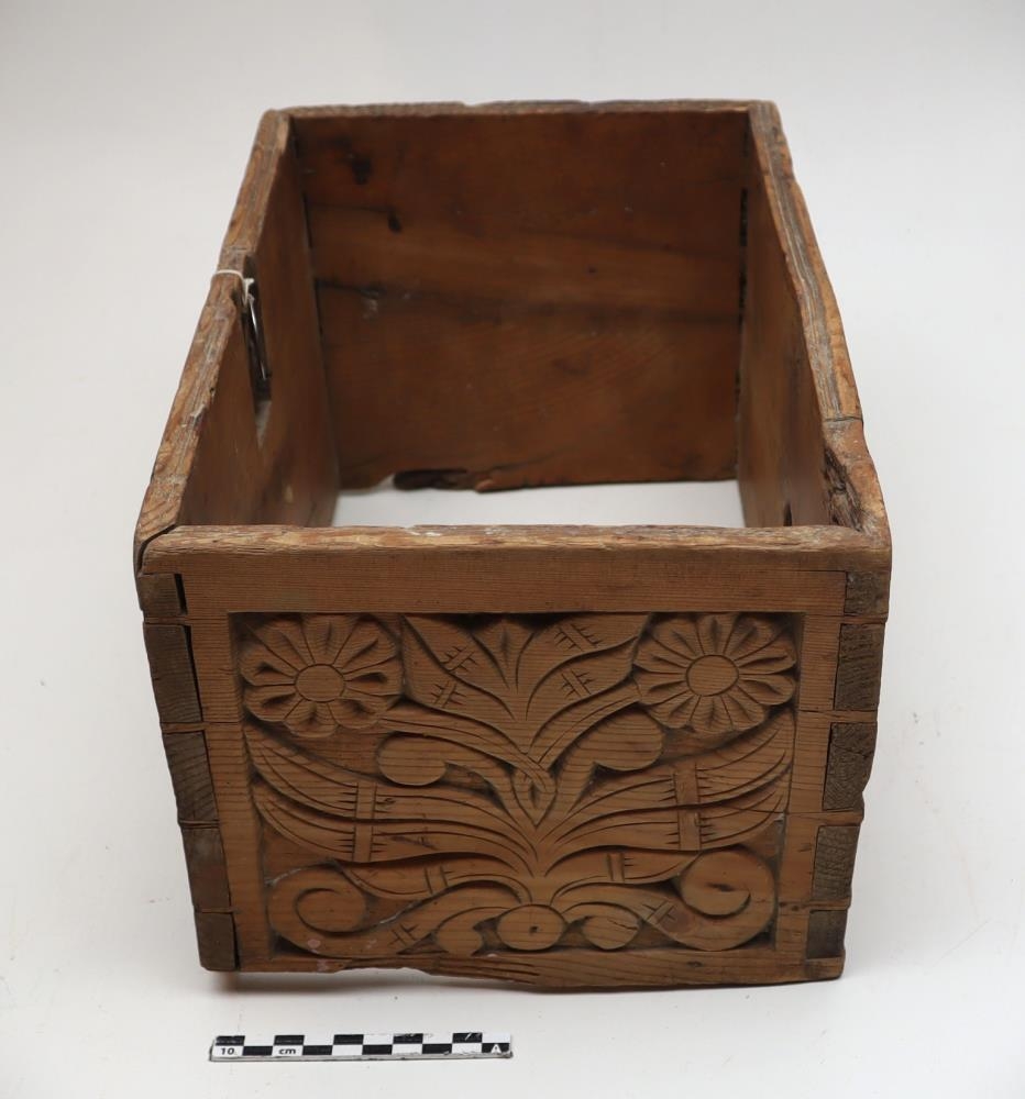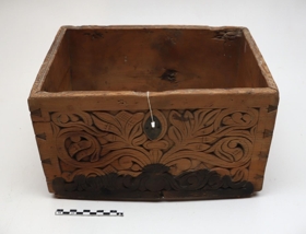 Kistill frá Bollastöðum í Blöndudal. Stærð: 33cm.L, 22cm.B, 19cm.H.Kistillinn er loklaus en allur útskorinn annars. Hann er örugglega talinn gerður af Bólu_Hjálmari.