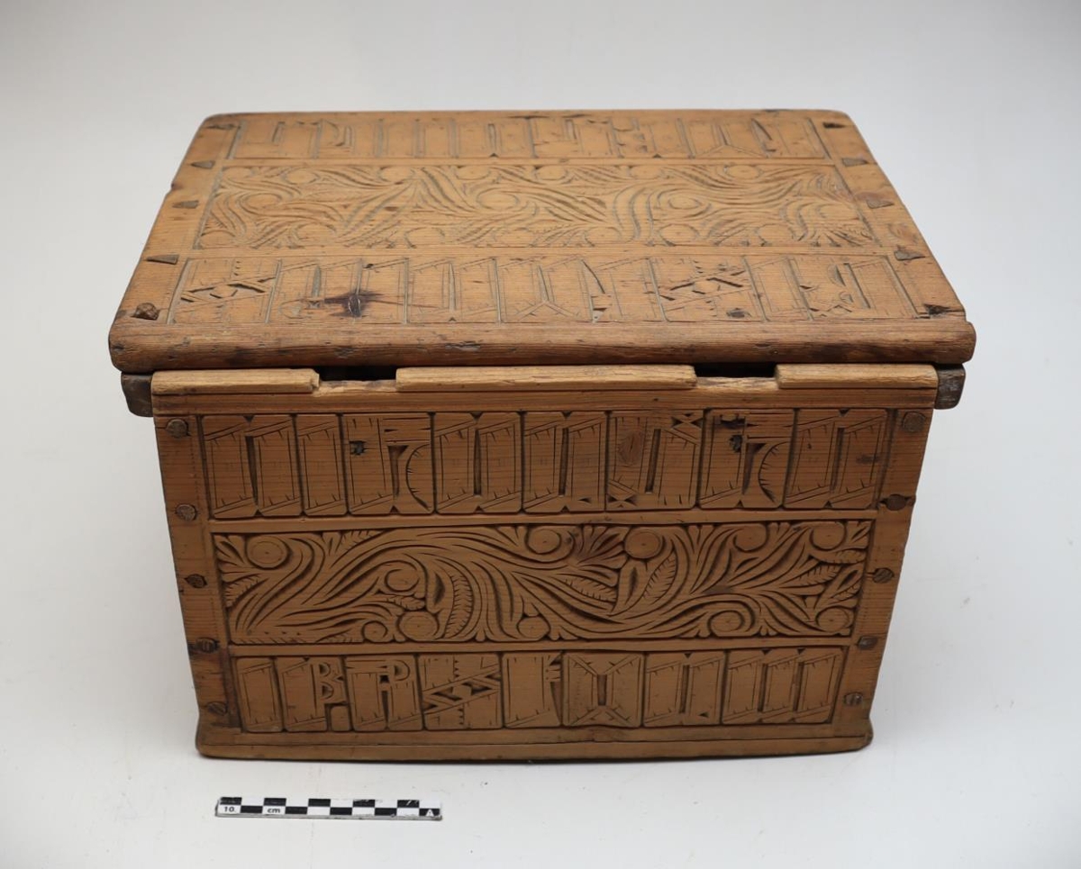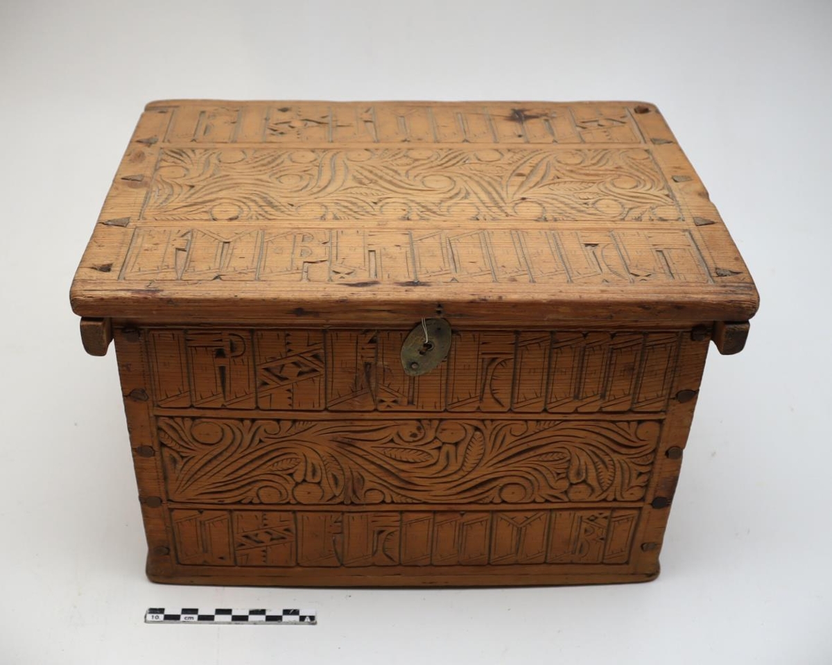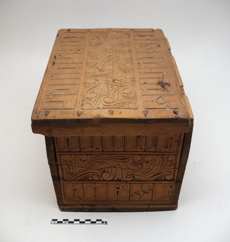 höfðaletri og blómamynstri. Trénegldur með hringlóttum nöglum. Kistillinn