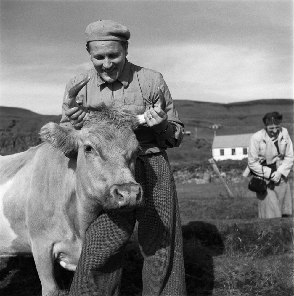 Vestur-Skaftafellssýsla. Kirkjubæjarhreppur. Kálfafell. Einar Magnússon, kennari og rektor heldur um horn á nauti.