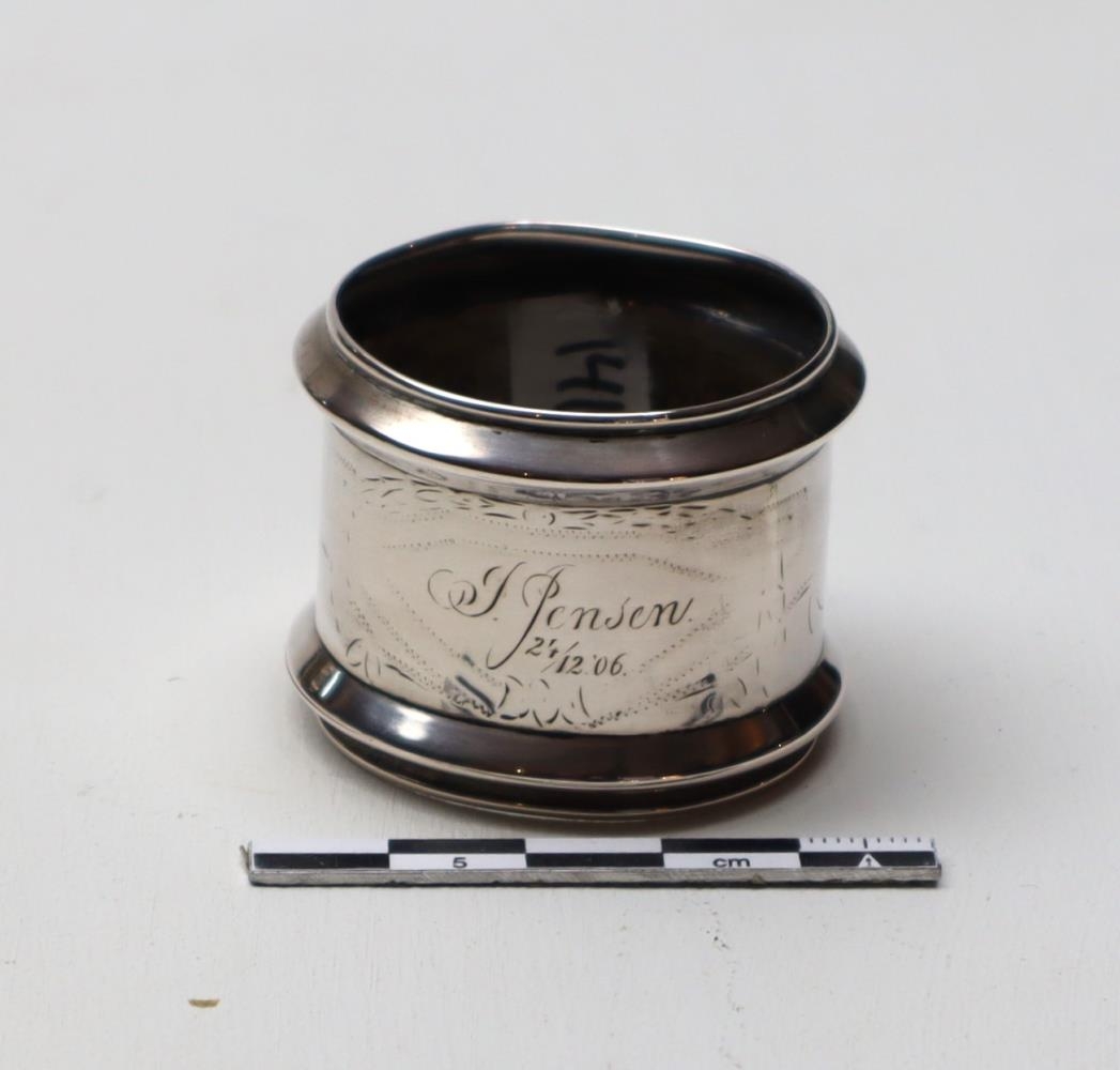 Servíettuhringur, nafn Ínu Jensen greypt í hann.