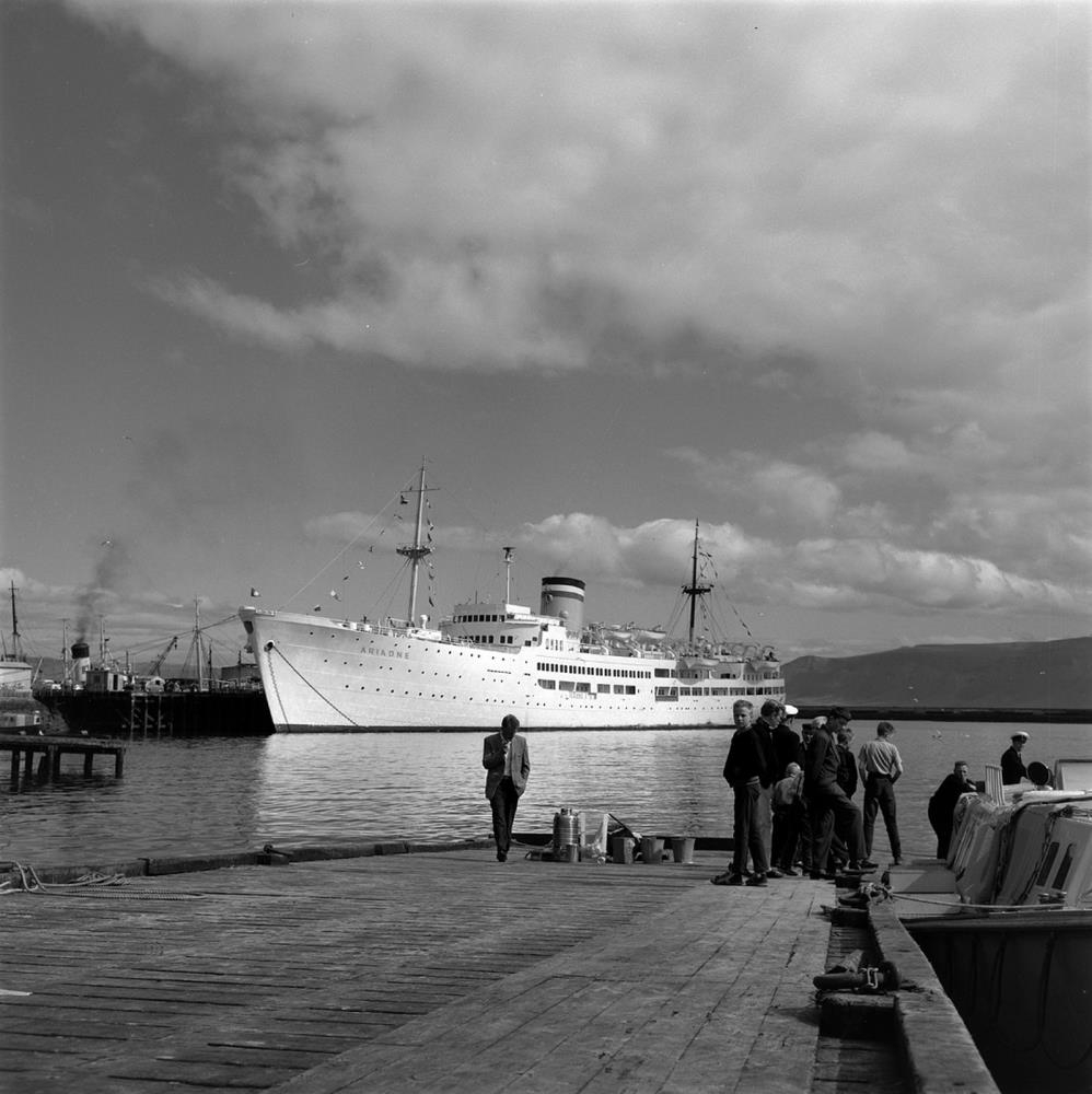 Skemmtiferðaskipin Gripsholm, Ariadne og Caronia. Ariadne liggur við bryggju. Karlmenn og drengir eru á bryggjunni að skoða skipin. Einnig eru starfsmenn skipanna.