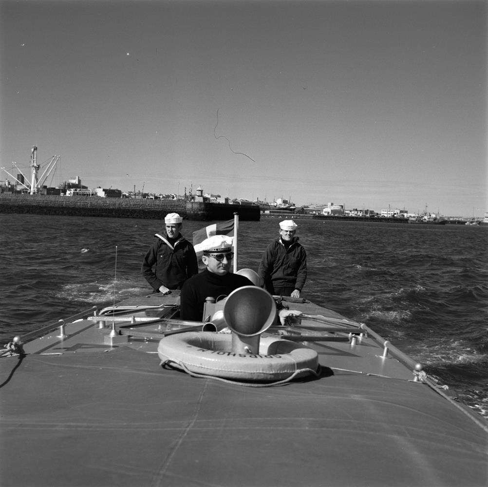 Skemmtiferðaskipin Gripsholm, Ariadne og Caronia. Þrír karlmenn í og við björgunarbát. Björgunarhringur í bátnum með nafninu Gripsholm.