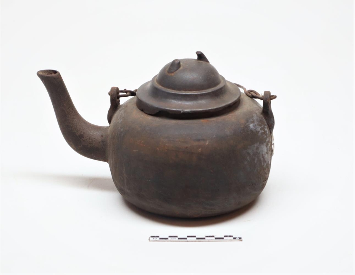Gamall pottketill, ryðbrunninn og illa farinn. Belgurinn er 18 cm í þvermál og með nokkuð sléttum hliðum, sem bogna inn uppi og niðri. Upp af belgnum er smá brík sem nær í hring og leggst lokið utan yfir hana. Framan og aftan á belgnum eru festingar fyrir handfangið sem er vírspotti. Á belgnum eru sprungur og stór göt.
