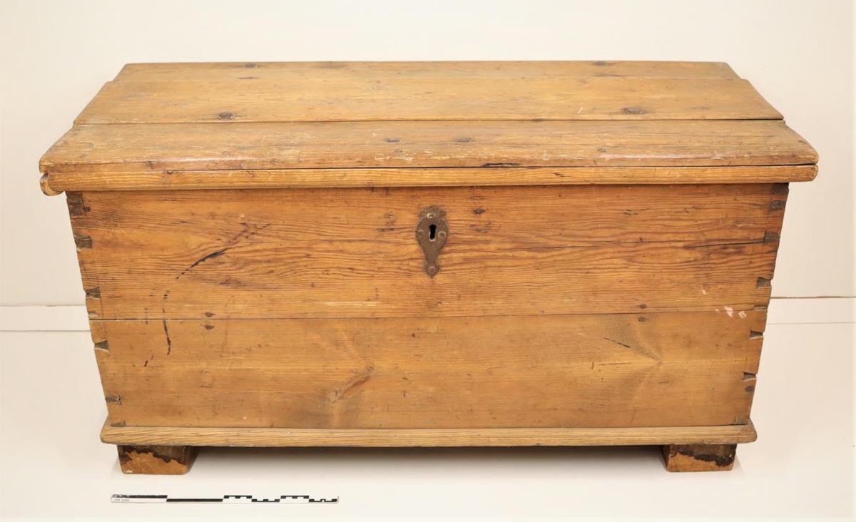 Ómáluð kista, geirnegld, með skrá og lykli. Hún er 1,02 m á lengd, 51 cm á breidd og 60 cm á hæð. Kistan er jafnbreið að ofan og neðan og lokið er slétt. Járhöldur af vejulegri gerð voru á sínhvorum enda og sú hægri er týnd. Smá brík skagar niður úr endum loksins og er hún trénegld. Skráin og hjarirnar eru af venjulegri gerð og járnnegld. Kistan er farin að gisna og láta á sjá.