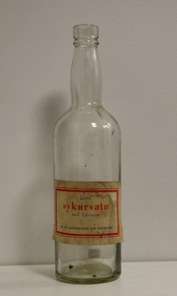 Glær gosdrykkjaflaska úr gleri. Álímdur hvítur miði með bláu og rauðu letri. Texti: Litað sykurvatn með kjörnum. Öl og gosdrykkir hf. - Akureyri.