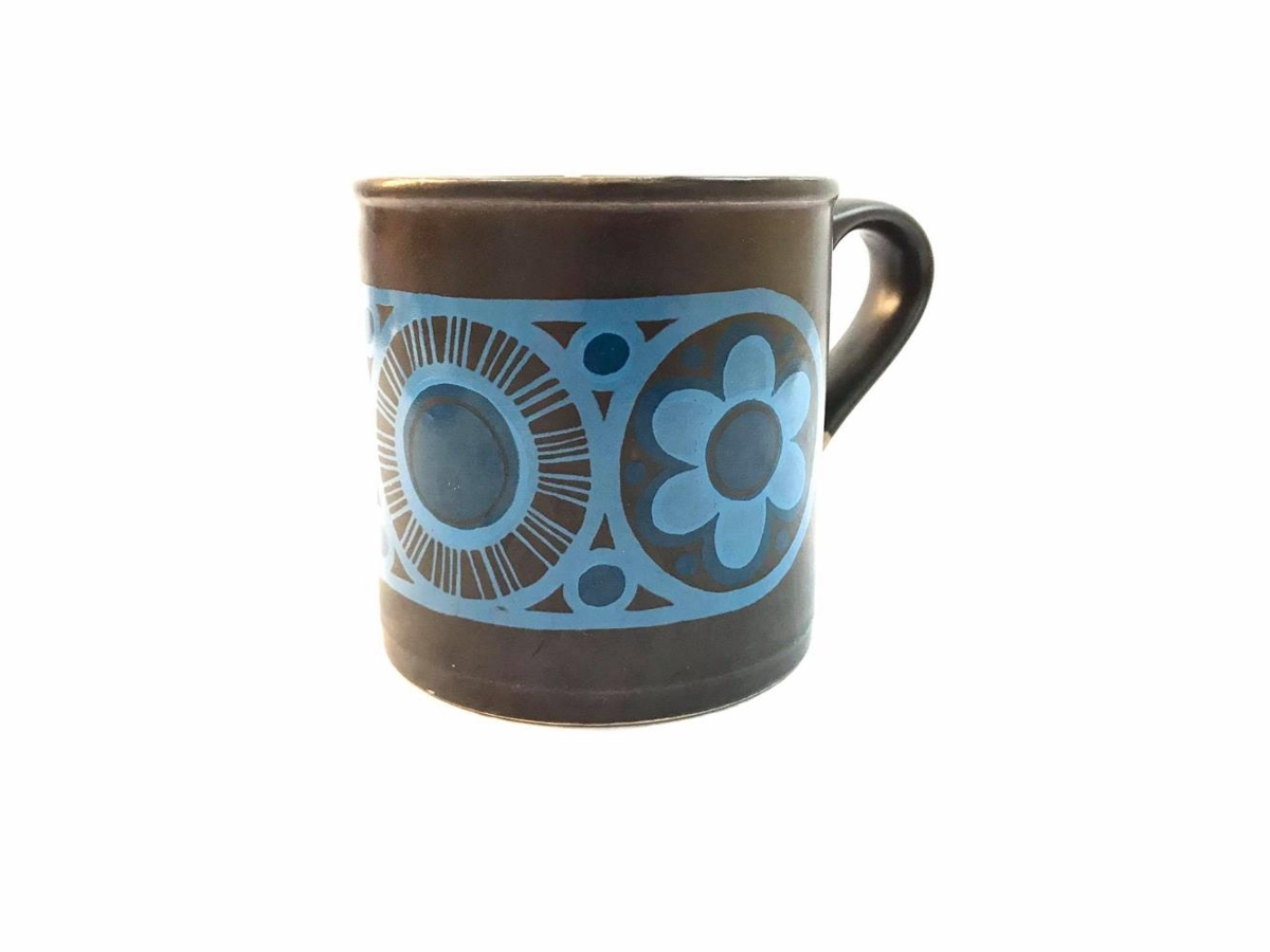 Brúnn bolli með stóru blómamynstri, blá blóm.