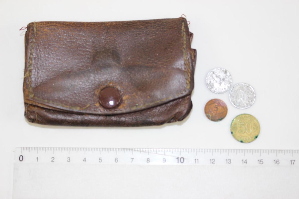 Lítið leður peningaveski með 52,5 krónum í. Kemur úr dánarbúi Hallgríms Ottóssonar af Sæbakka.