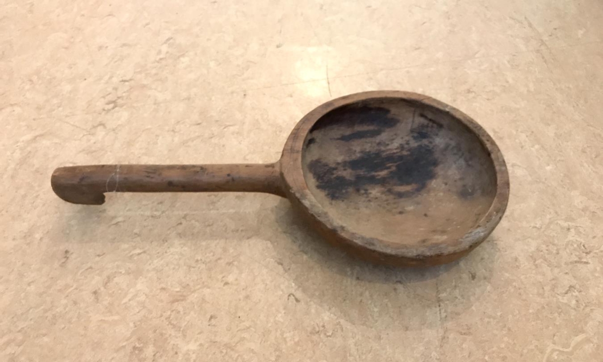 Kornausa úr tré 38 cm á lengd. Hún er af mjög svipaðri gerð og nr. 498, nema hvað handfangið er kringlótt og skálin er ekki eins djúp.