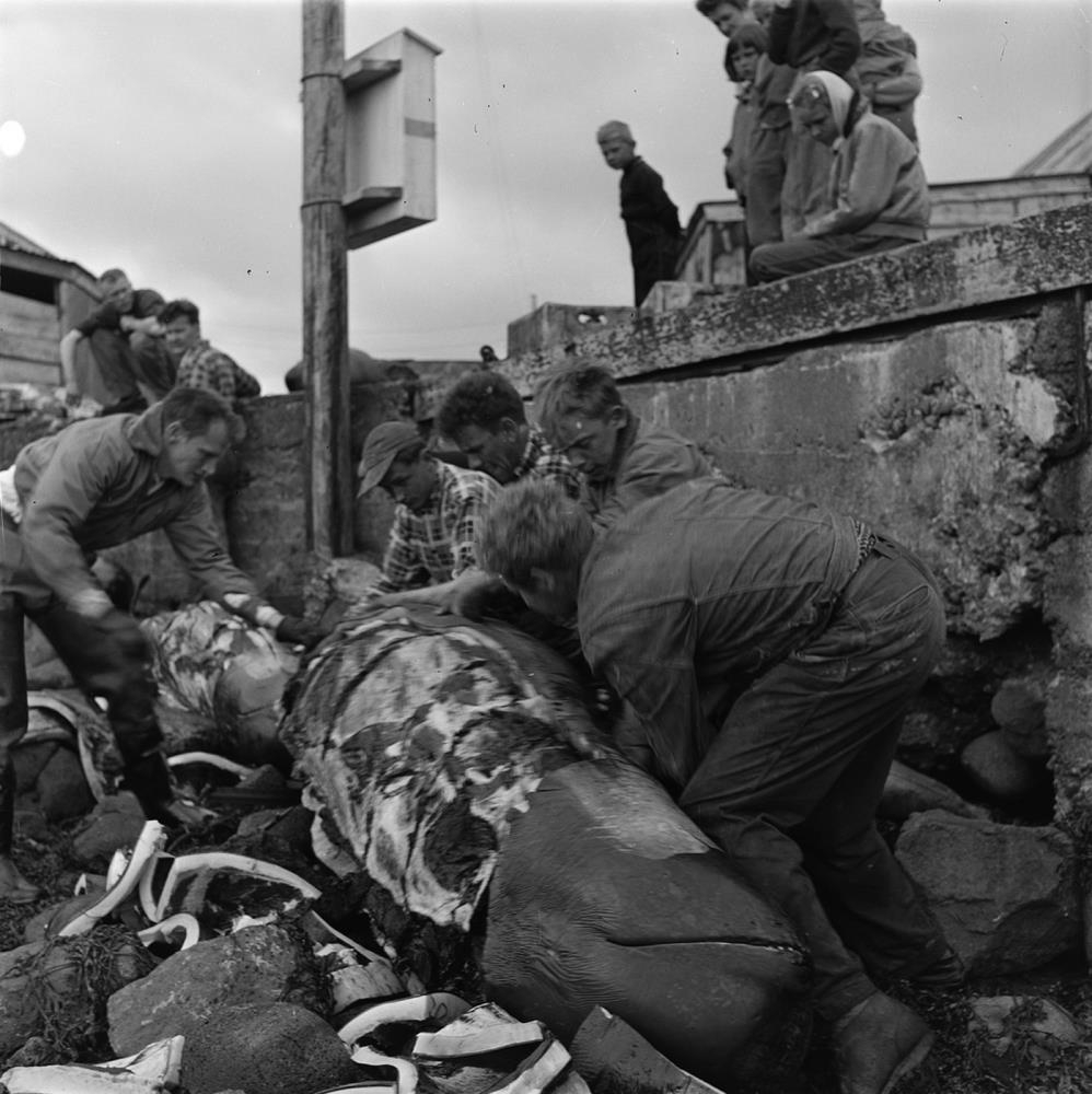 Frá hvalskurði í Ytri-Njarðvík. Um 100 marsvín rekin á land í Ytri-Njarðvík í júlí árið 1957