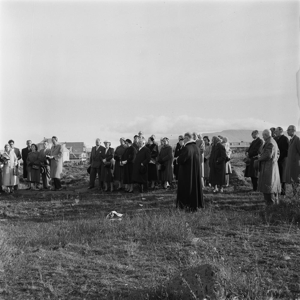 Bygging Háteigskirkju í Reykjavík hefst með því að formaður sóknarnefndar, Þórður Jasonarson, tekur fyristu skóflustunguna. Sr. Jón Þorvarðarson prestur safnaðarins sést á myndinni
