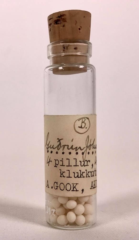 Lítið aflangt mjótt meðalaglas. Glært gler með korktappa. Í glasinu eru litlar hvítar pillur - nánast fullt. Hvítur miði með prentstöfum : 4 pillur 4 hvern klukkutíma. A. Gook. Akureyri. Handskrifað : Guðrún Jóhannesdóttir.
