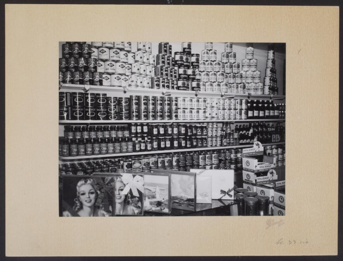 24. Niðursuðuvörur í hillum og pakkamatur. Sjóðvél, reiknivél og vigt á