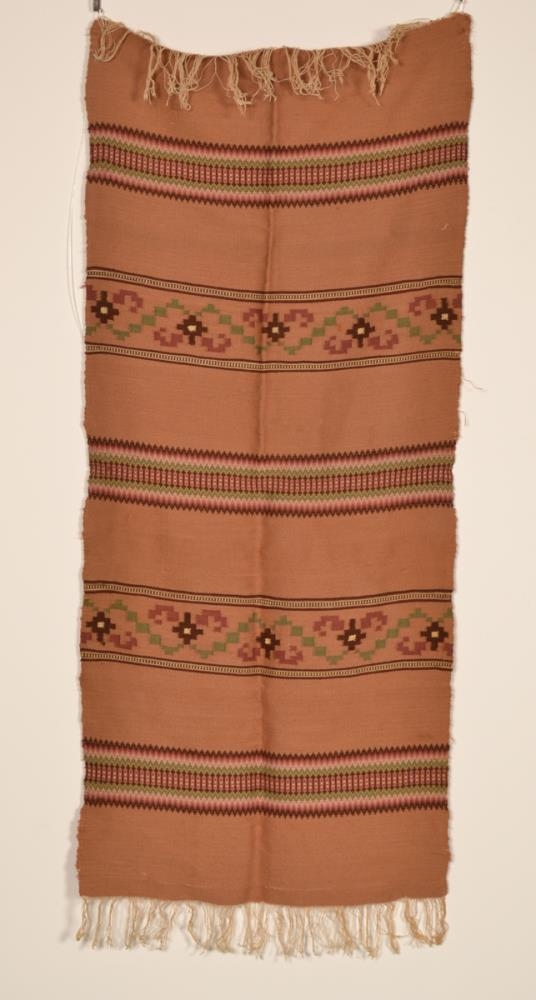 Ljósbrúnn dúkur með bleiku, hvítu og grænu mynstri. Skólaverkefni frá Húsmæðraskólanum á Hallormsstað
