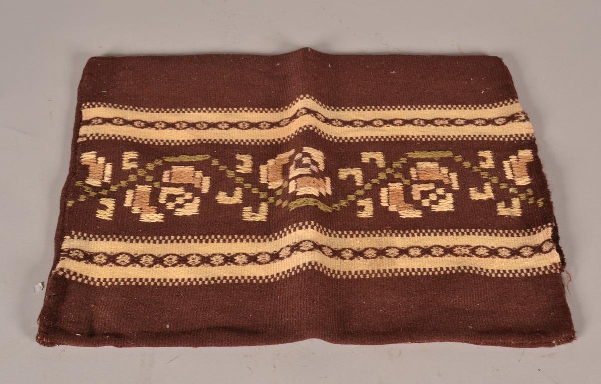 Dökkbrúnt púðaver með gulu og grænu mynstri. Skólaverkefni frá Húsmæðraskólanum á Hallormsstað.