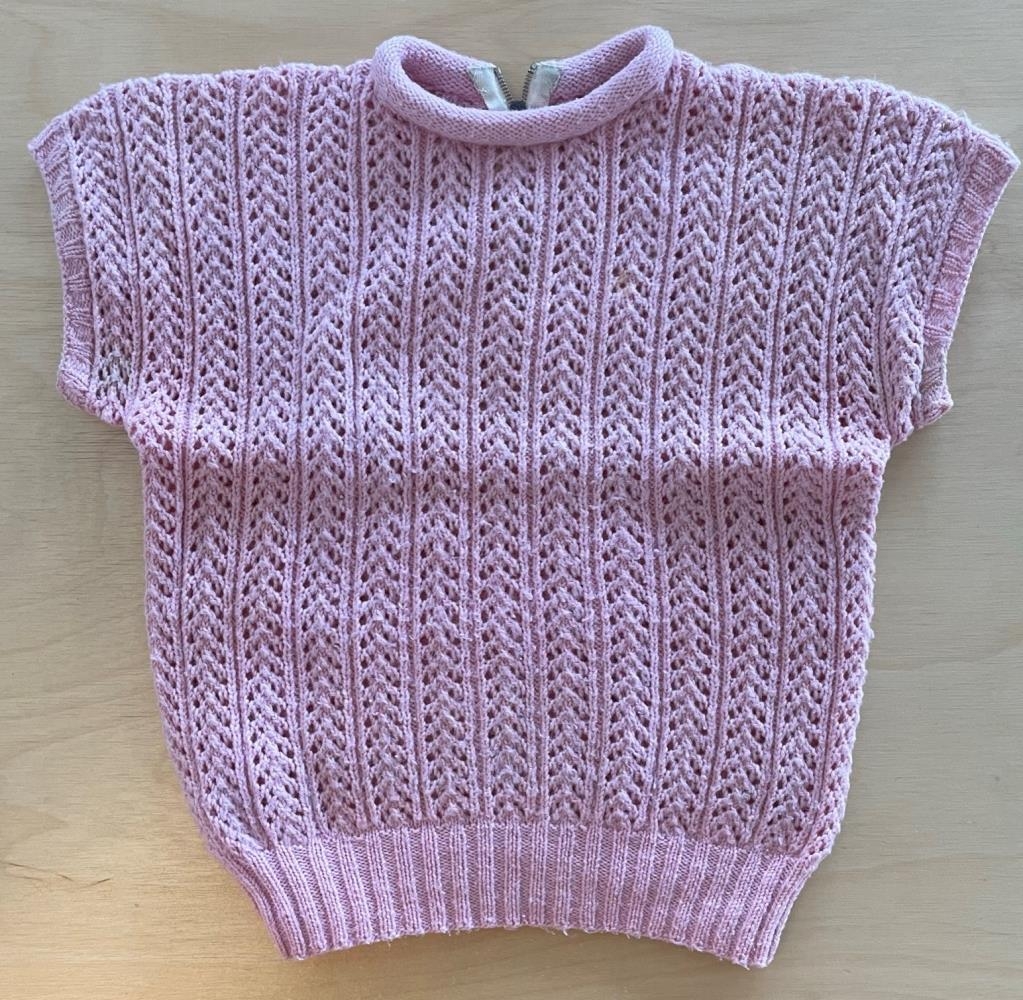 Telpupeysa, bleik að lit, útprjónuð, renniás aftan á hálsi. Lengd frá öxl er 41 cm. Ummál yfir brjóst er 70 cm.