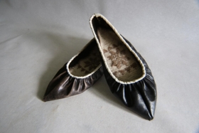 Eftirlíking af sauðskinsskóm. Unnið af gefanda, Oddnýju Methúsalemsdóttur. Guðrún Kristinsdóttir prjónaði íleppana.