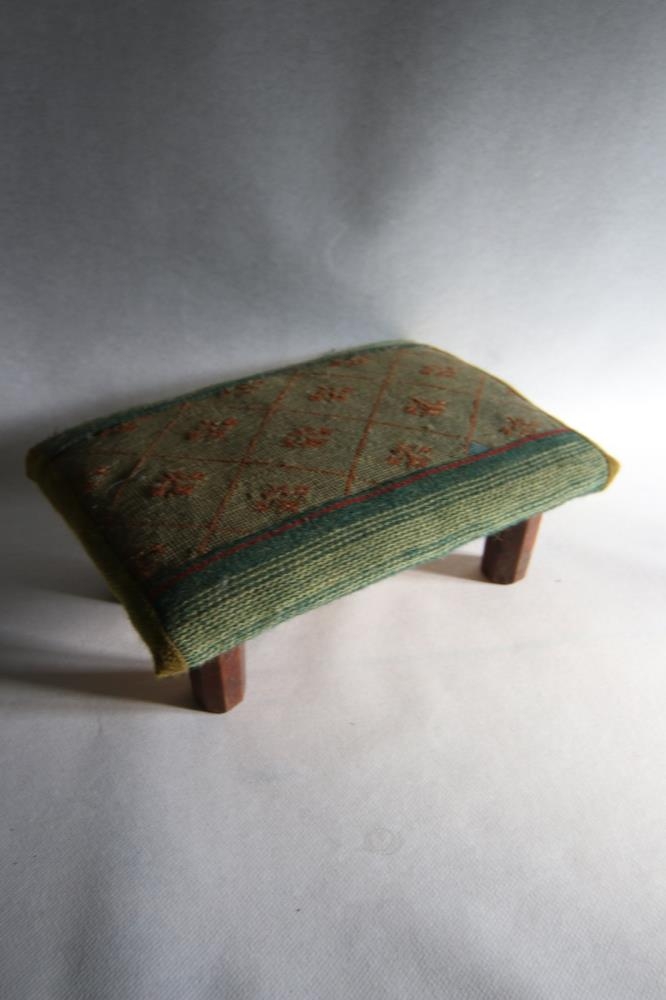 Fótaskemill með grænu áklæði með rauðu tígulmynstri og laufum. Skemilinn smíðaði Oddný Methúsalemsdóttir og áklæðið saumaði Elín Ólafsdóttir, móðir hennar og húsfreyja á Bustarfelli.