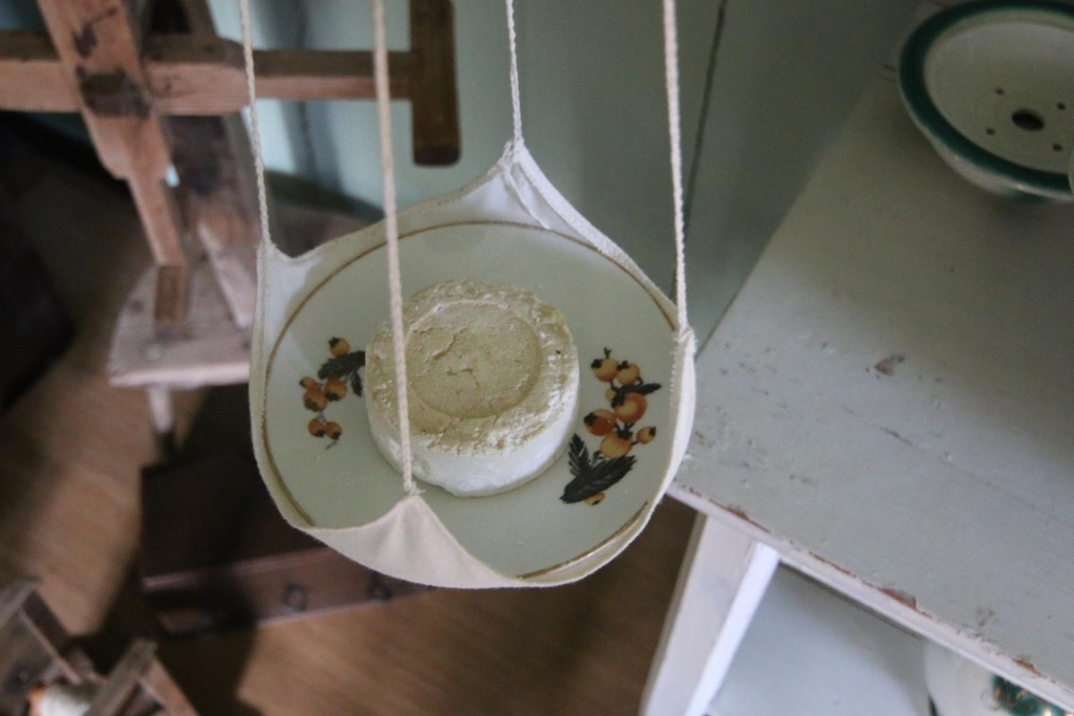 Sápuhengi úr hvítu lérefti með heimagerðri sápu í lítilli skál. Var notað hjá servanti með þvottaskál.