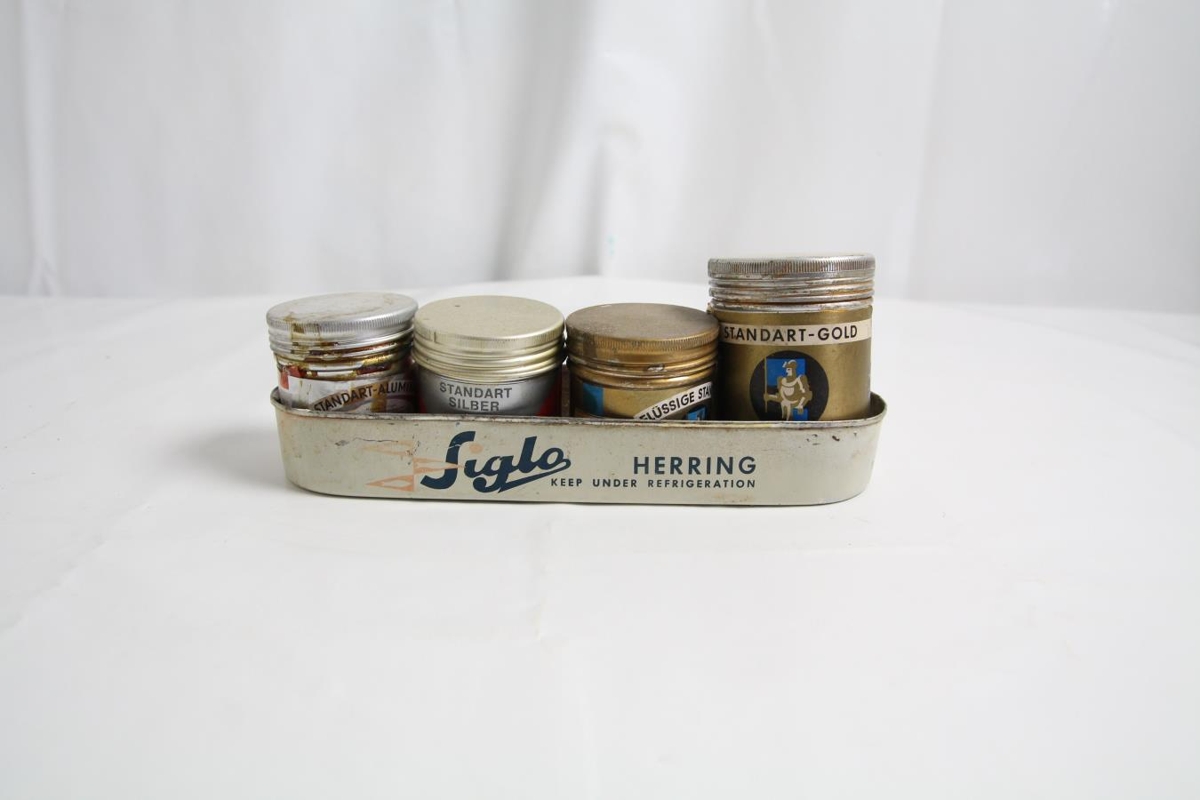Fjórar málninga dósir í eigu Svavars Guðnasonar listmálara. Bronze, Gold, Goldbronze og Silfur. Málningadósir geymdar í gamlari síldar öskju.