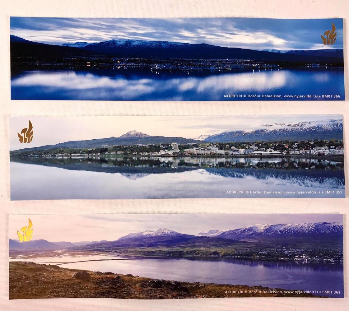 3 bókamerki úr pappa. Hátíðar skjaldamerki Akureyrar og myndir af bænum í þrem útgáfun en svipuðum sjónarhornum, teknar til móts við bæinn hinumegin við fjörðinn, fjöllin Súlur og Hlíðarfjall í baksýn og Pollurinn í forgrunn. Ein kvöldmynd sem snýr meira að Hlíðarfjalli, önnur sumar eða haustmynd sem nær Leirunum með á myndina og svo sumarmynd þar sem fjöllin speglast í Pollinum. Ljósmyndari Hörður Daníelsson.