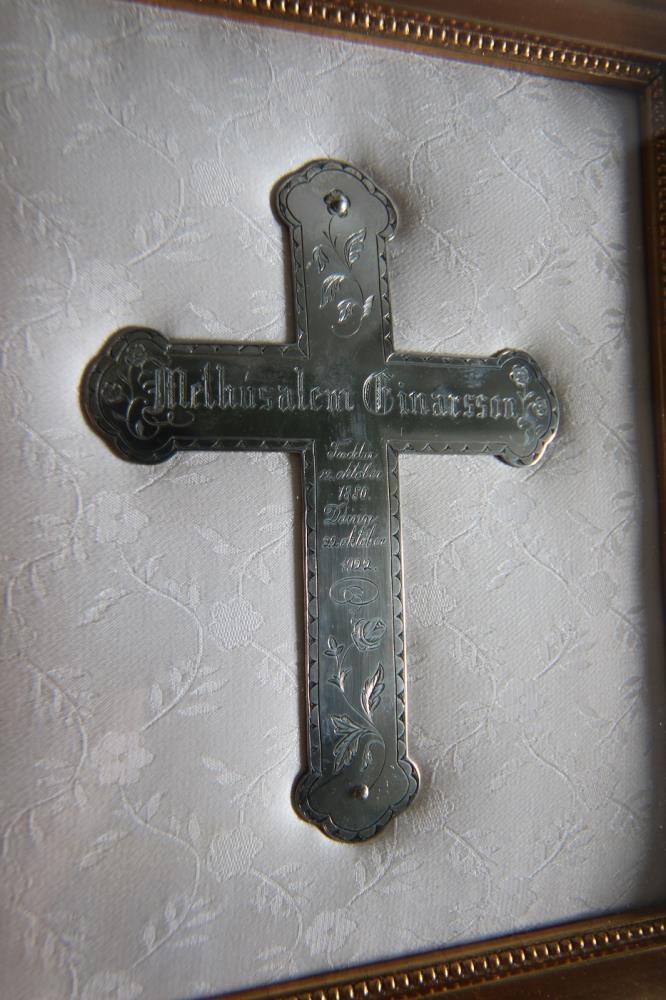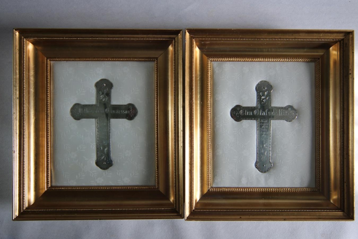 Minningarkrossar. Tveir áletraðir silfurkrossar sem börn hjónanna Elínar Ólafsdóttur og Methúsalems Einarssonar, Bustarfelli, létu gera til minningar um þau. Krossarnir eru á hvítu líni með blómamynstri í gylltum, djúpum römmum.