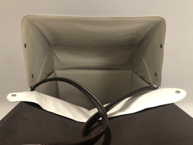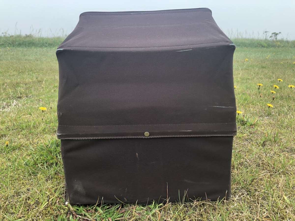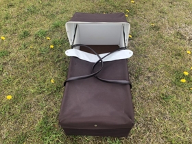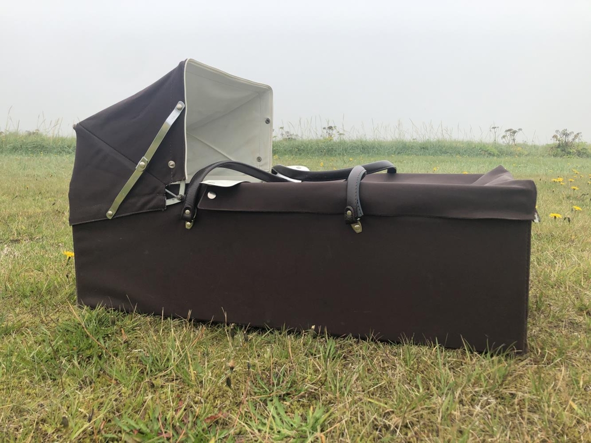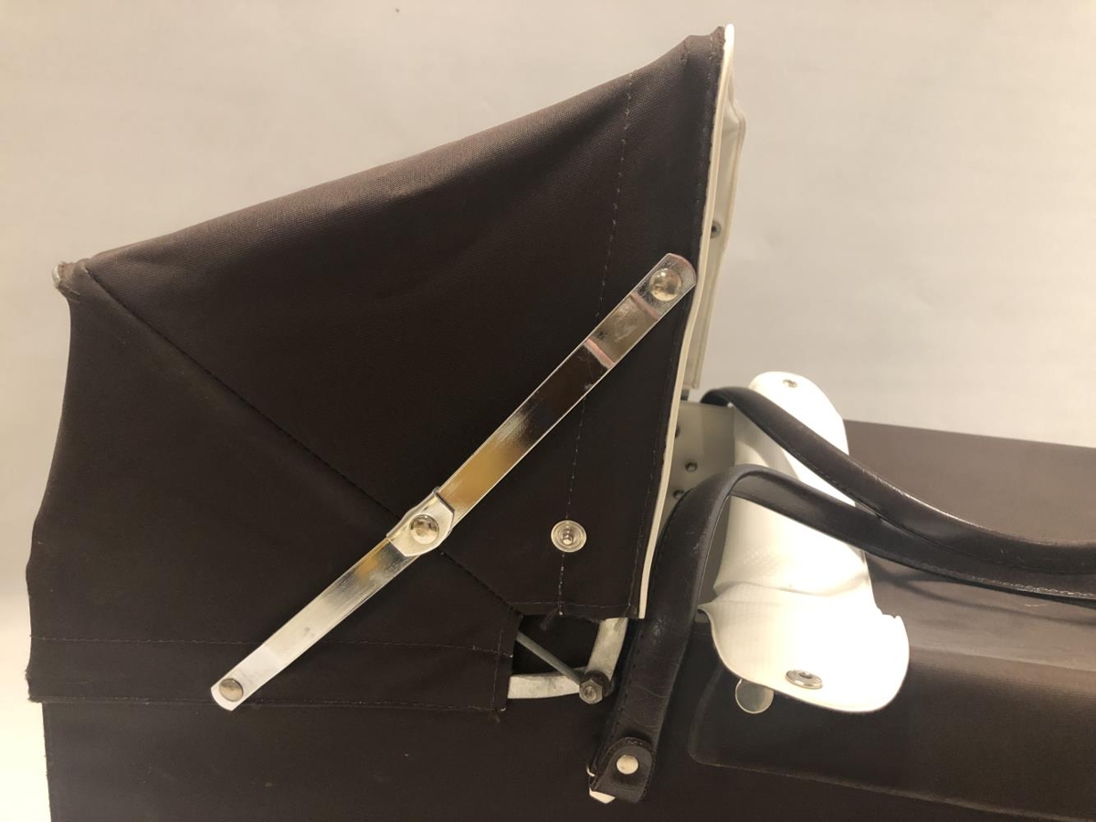 Brúnt og hvítt burðarrúm. Munur tengdur Hátúni. Hægt að smella svuntu af og fella skerm niður. Plastklætt að innan og viðarplata í botni, engin dýna. Burðarrúmið svipar til þeirra sem voru notuð um 1970, 1980. Burðarrúmið var notað af Ingibjörgu Eiríksdóttur frá Hátúni og sváfu í því synir hennar.
