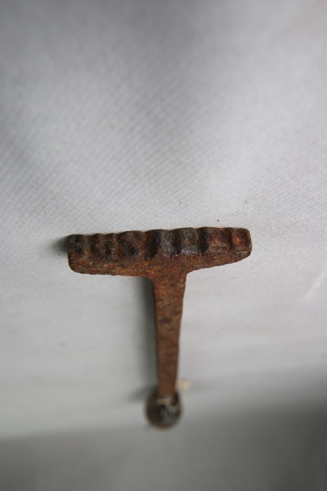 Brennijárn frá Bustarfelli. Mjög ryðgað orðið, en á hausnum á að standa: "BUSTFELL" (myndin er spegluð). Úr búi Methúsalems Einarssonar.