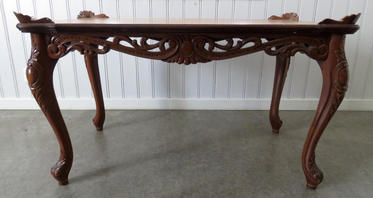 Útskorið sófaborð í eigu Páls Guðjónssonar og Huldu Guðmundsdóttur. Kom með skrautfjöl og kistli.