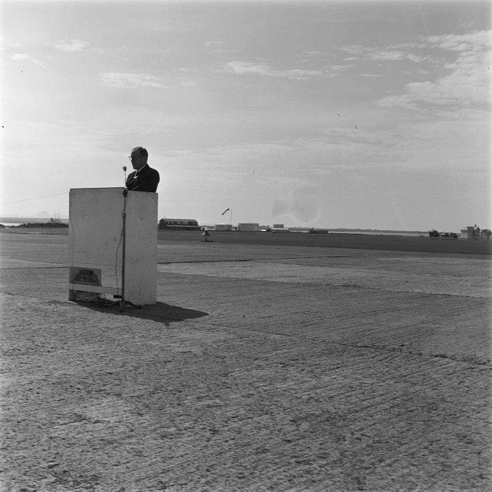 Frá hátíðarhöldunum á "Flugdaginn" á Rekjarvíkurflugvelli. Hákon Guðmundsson, formaður Flugmálafélags Íslands, flytur setningarræðu.
