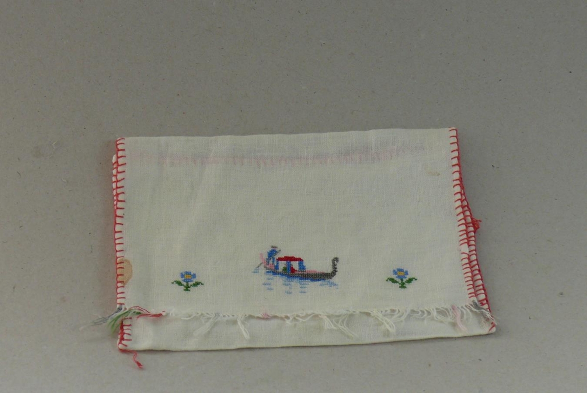 hvítur, rauður saumur á hliðum, ísaumað mjög fínt, maður á bát sem ýtir honum áfram með stjaka, farþegi undir húsi, blóm til beggja hliða