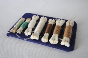 Dökkgrænn þelþráður spunninn af Rannveigu Sigfúsdóttur frá Skjögrastöðum í Skógum.