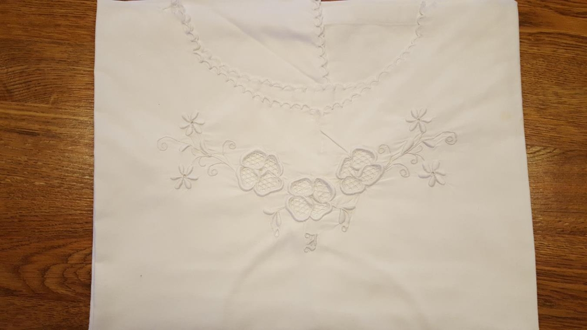 Náttkjóll. Skósíður. Úr hvítu lérefti. Útsaumur á brjósti og líningum.