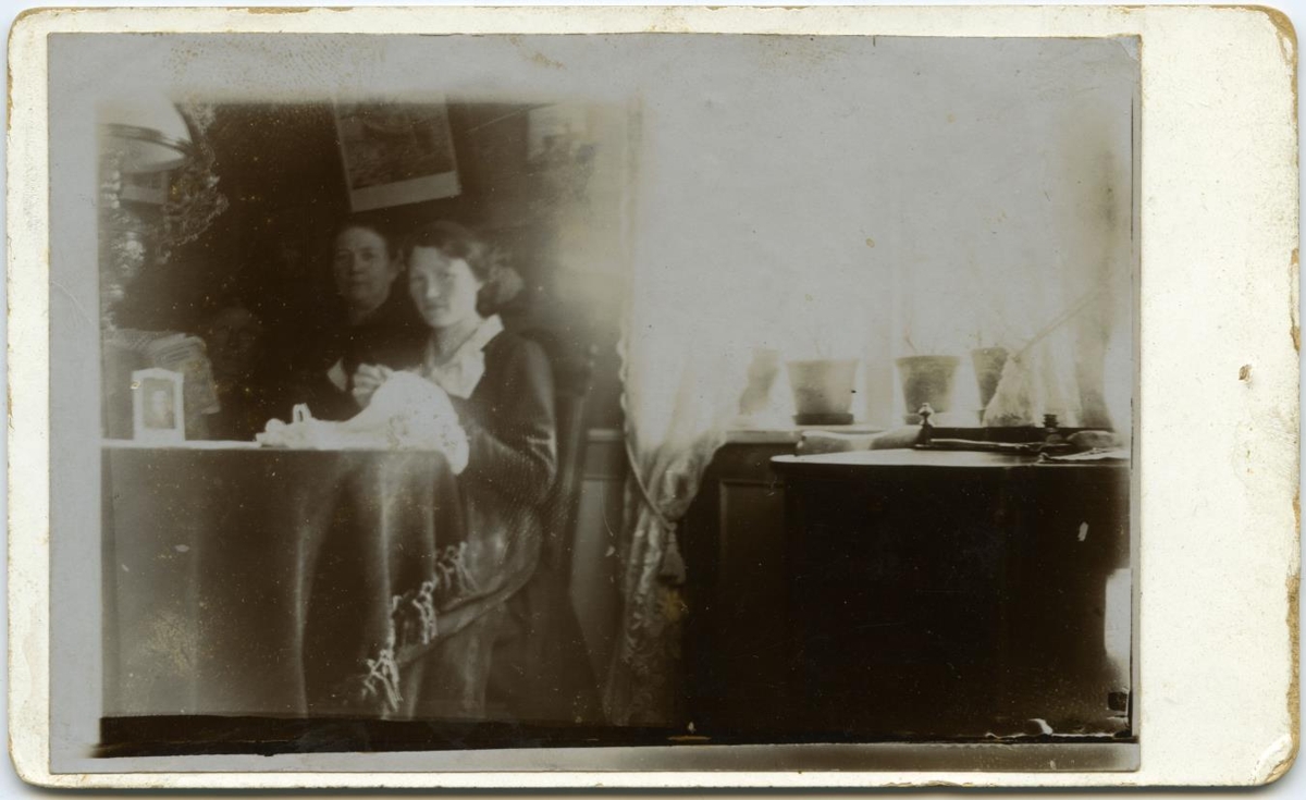 Tvær konur sitja í stofu við sauma. blómapottar í glugga, olíulampi yfir borði. Myndir á veggjum.