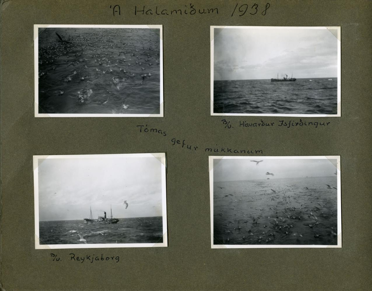 Síða úr albúmi með fjórum ljósmyndum undir yfirskriftinni: "Á Halamiðum 1938." Undir einstakar myndir er skrifað: b/v Hávarður Ísfirðingur og b/v Reykjaborg en milli tveggja mynda Tómas gefur múkkanum. Tvær myndanna sýna skip á siglingu og aðrar tvær múkka við skipshlið á sjó.
