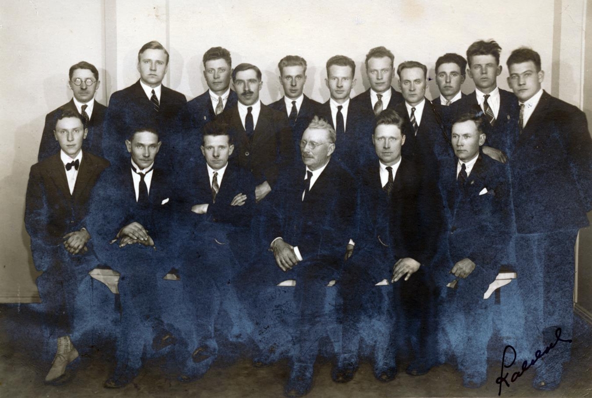 Mynd af karlakórnum Bræðurnir, frá Borgarfirði, tekin af Jóni Kaldal, ljósmyndara. Nöfn mannana og sveitabæir eru skrifaðir á bakhlið.