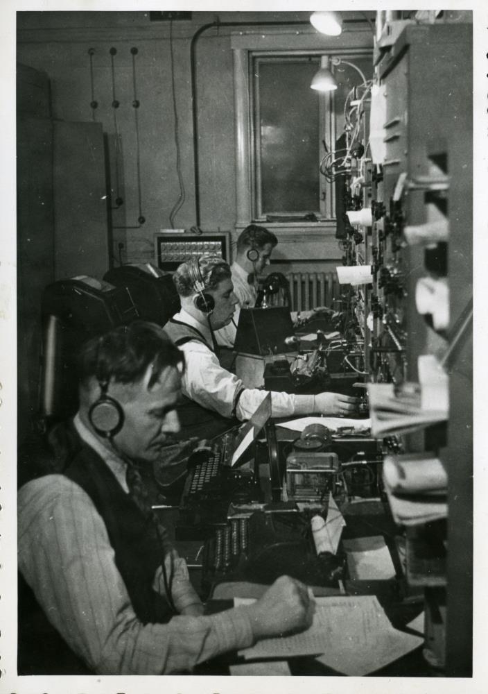 Þrír karlmenn sitja við vinnuborð með heyrnartól á höfði, ritvél fyrir framan sig og ýmiss konar búnað á eins konar símborði eða -vegg fyrir framan sig. Líklega ritsími.