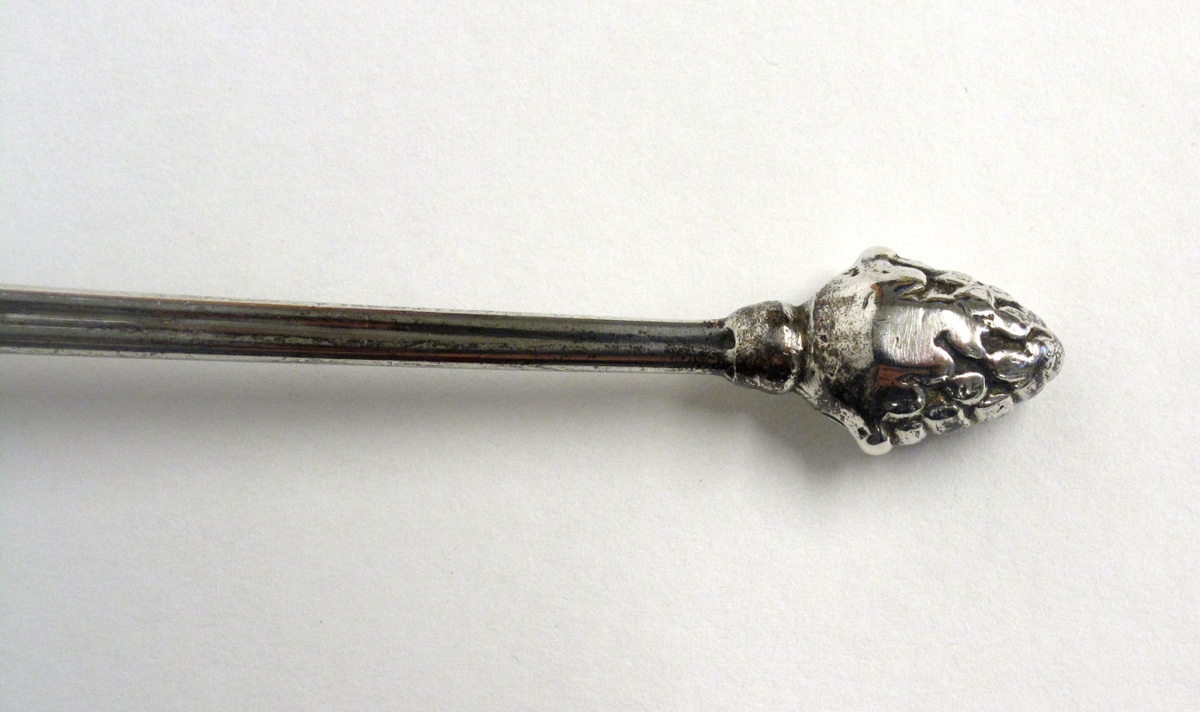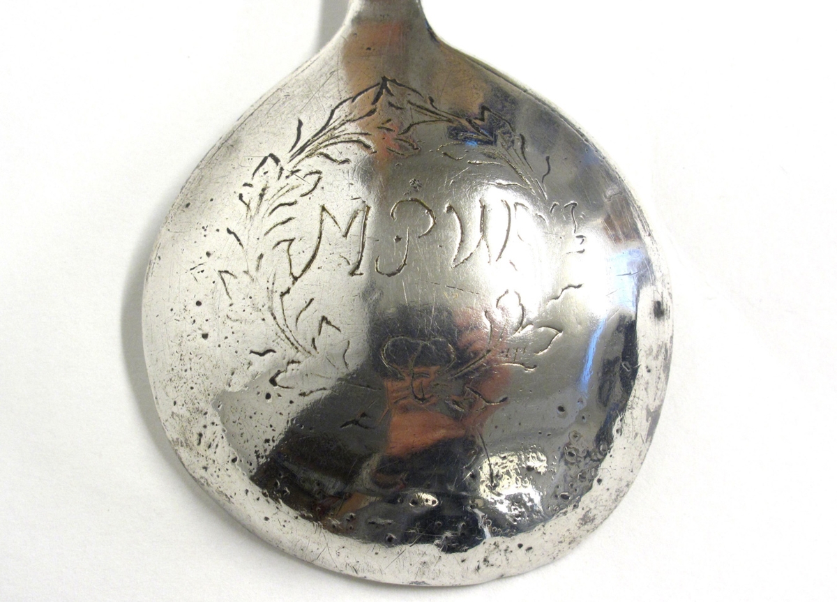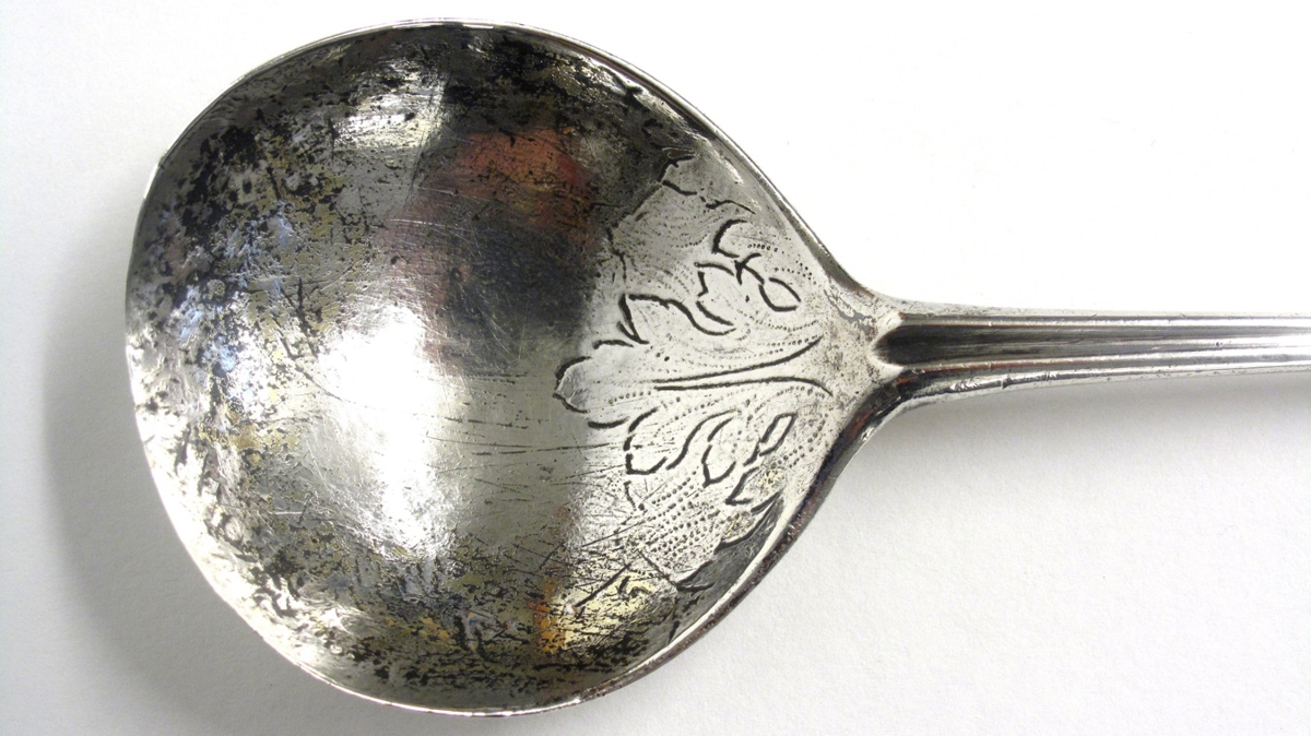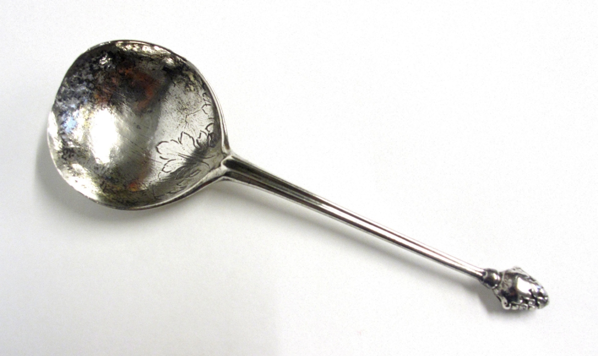 Silfurskeið, svokölluð hnappskeið. Þetta er matskeið með nálægt því hringlaga blaði og mjóu, sívölu skafti. Á enda þess er hnappur, í líki akarns. Í blaðið innanvert er grafið blaðskraut en í það neðanvert grafinn laufkrans og innan hans stafirnir M•P•W (MPW) sem að líkindum eru upphafsstafir fyrsta eiganda skeiðarinnar. Skeiðin er 16,4 cm löng. Skaftið er tæpir 11 cm (þar af er hnappurinn 1,8 cm langur) og blaðið er um 5,5 cm langt, 5,5 cm breitt og 1,3 cm djúpt (að utanmáli). Skaftið er grennst upp við hnappinn, 0,3 cm í þvermál, en sverast næst blaðinu, 0,8 cm í þvermál.