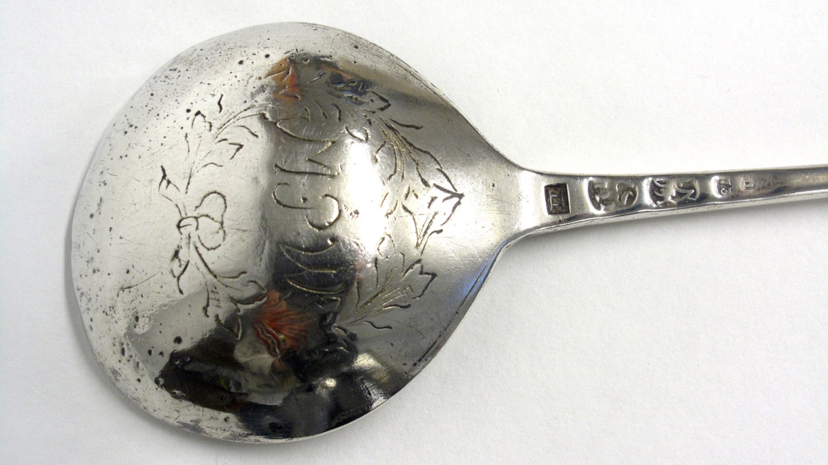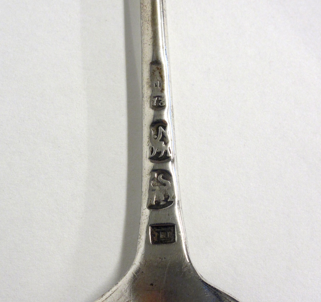 Skeiðin er dönsk. Á skaftinu neðanverðu eru fjórir stimplar. Efst er borgarmerki Kaupmannahafnar, þrír turnar, og þar undir 73, sem táknar ártalið 1773. Næst er silfurvarðarstimpillinn P•N V•H (PNVH). Það er stimpill Peter Nicolai von Haven, sem var silfurvörður Kaupmannahafnar á árunum 1729-1749. Þriðji stimpillinn er smiðsstimpillinn CS 1722. Það er stimpill Christian Schrader (f. 1672, d. 1739), skartgripasmiðs og silfursmiðs í Kaupmannahöfn. Hann hefur því smíðað skeiðina árið 1722. Neðst er svo mánaðarstimpill tvíburamerkisins, II (stimpill sem notaður var á árabilinu 1676-1830), sem táknar tímabilið 22.5.-21.6. (22 maí til 21. júní). Það vekur athygli hversu langur tími er á milli ártalsstimplanna, þ.e. smiðsstimpilsins árið 1722, silfurvarðastimpilsins (1729-1749) og borgarmerkisins árið 1773.