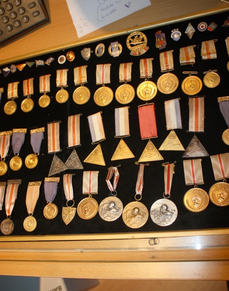 Verðlaunapeningar í sundi frá 1951 til 1963, sem Sigurður Sigurðsson (1939-) frá Akranesi vann í hinum ýmsu sundkeppnum. Einnig eru nokkur barmmerki.